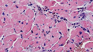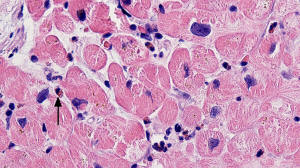 Histology: H&E stains (Figures A, B) demonstrate myocardium with increased
