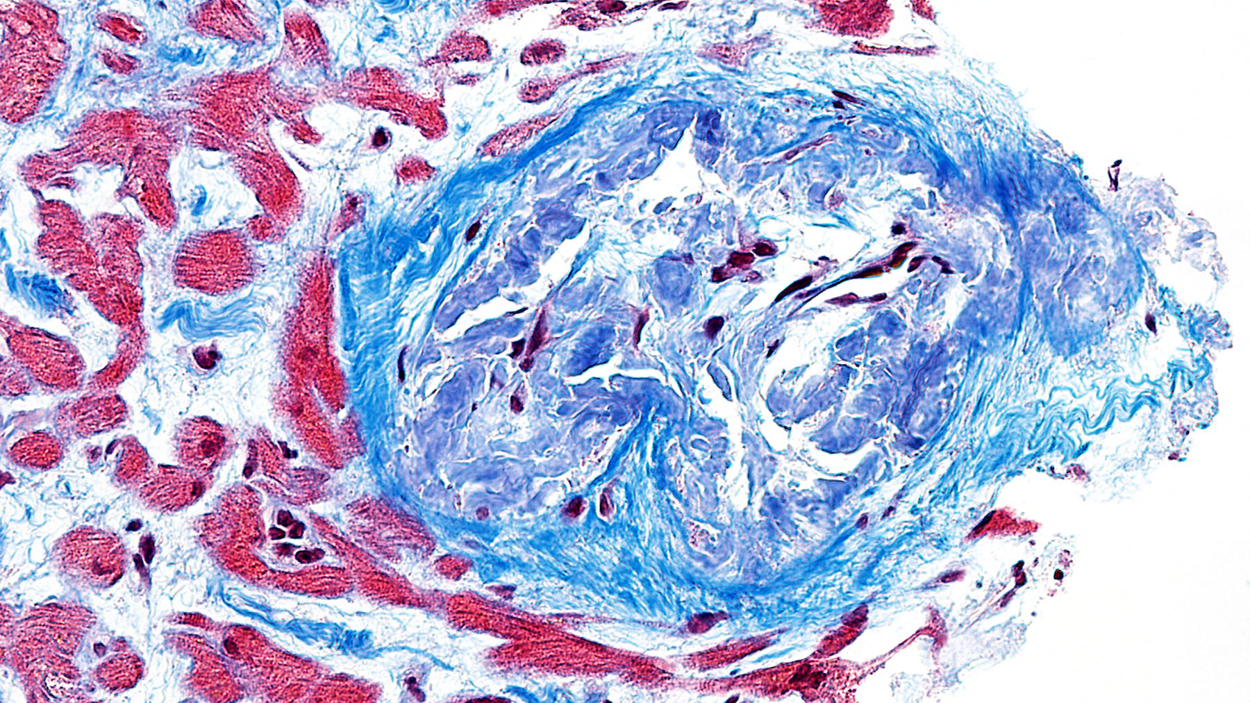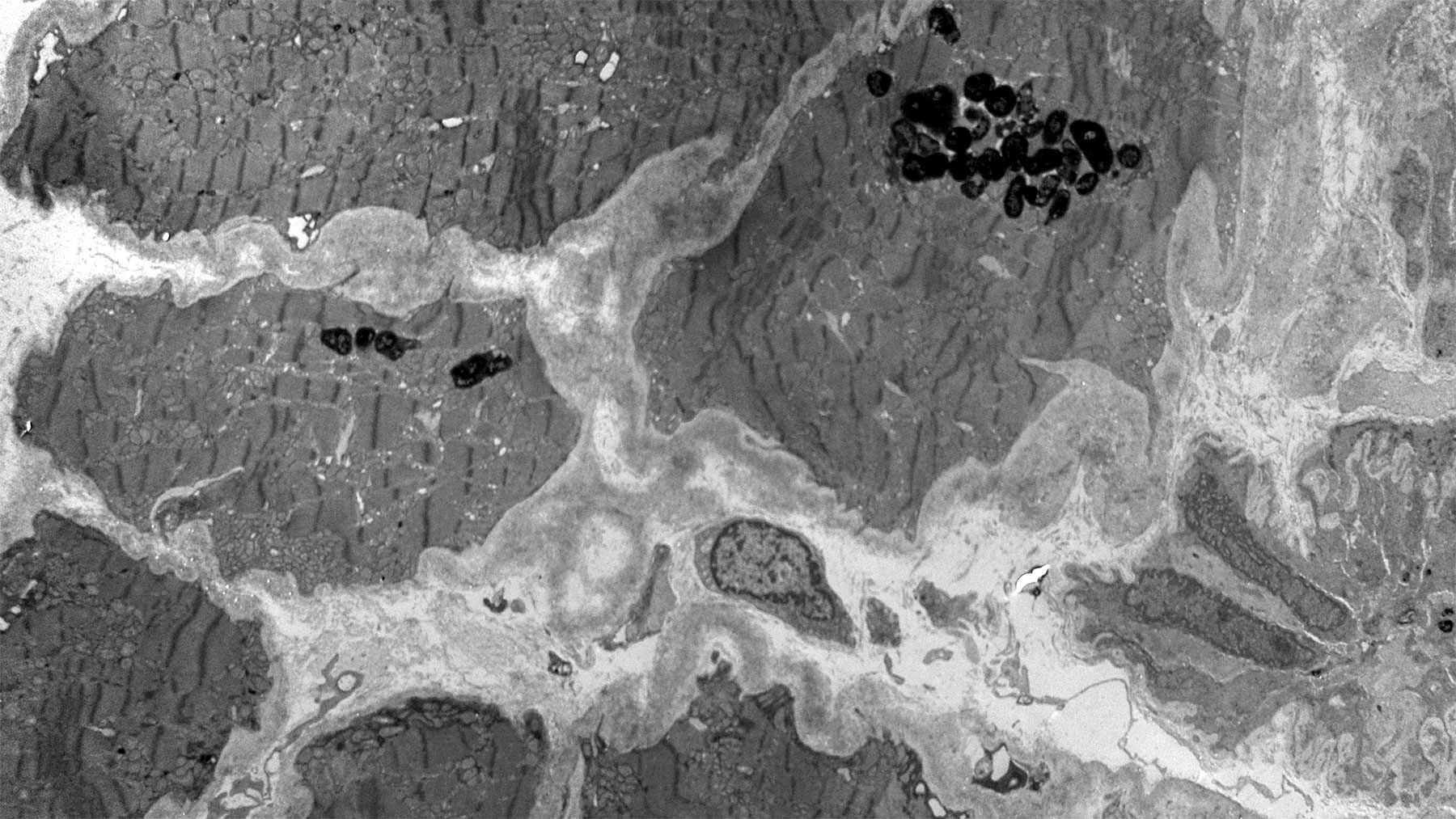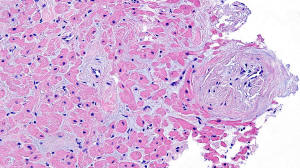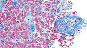 unremarkable cardiomyocytes and mild to moderate interstitial fibrosis, confirmed by trichrome staining