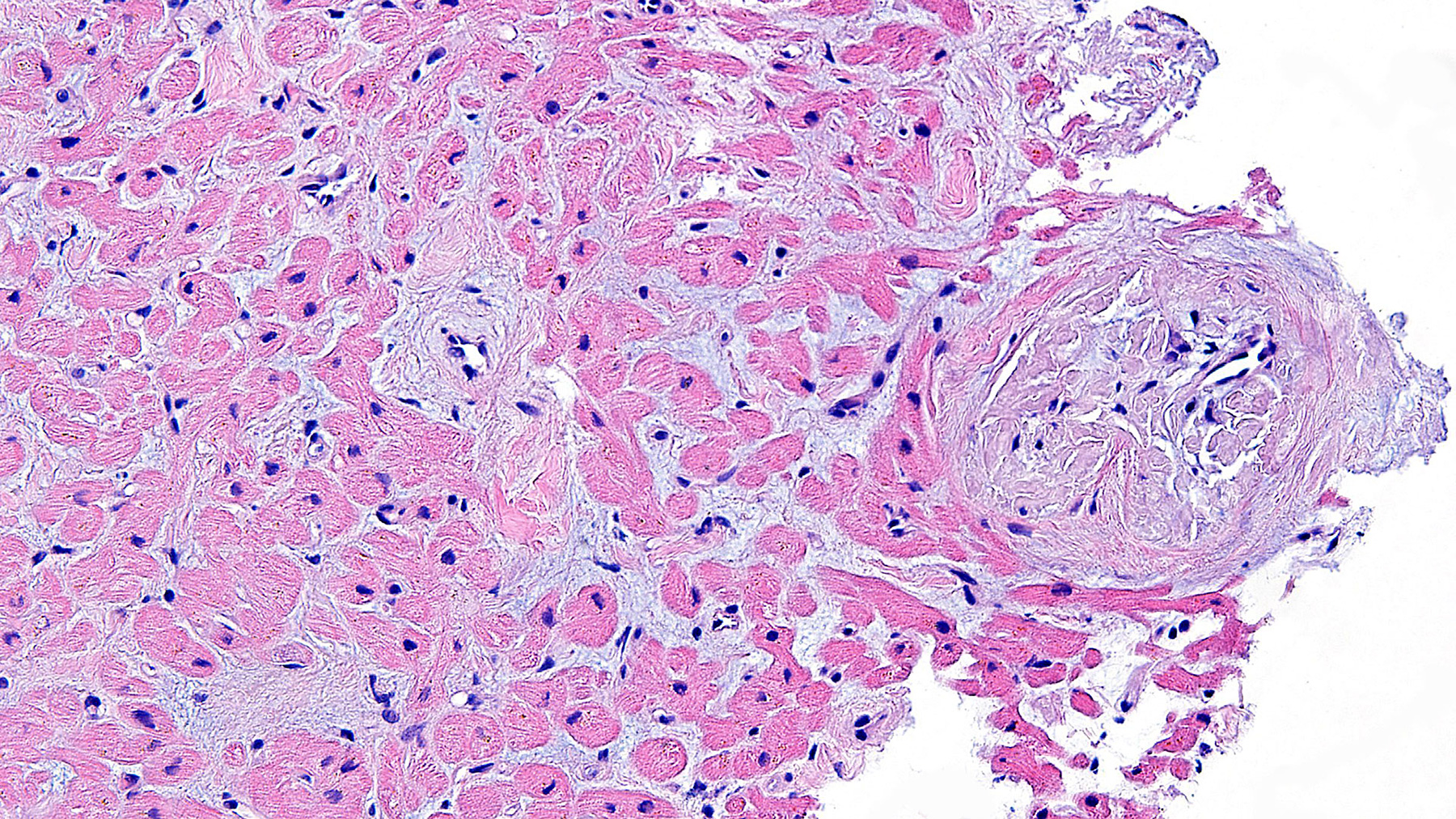 cardiomyocytes and vascular structures surrounded by a fibrillary material